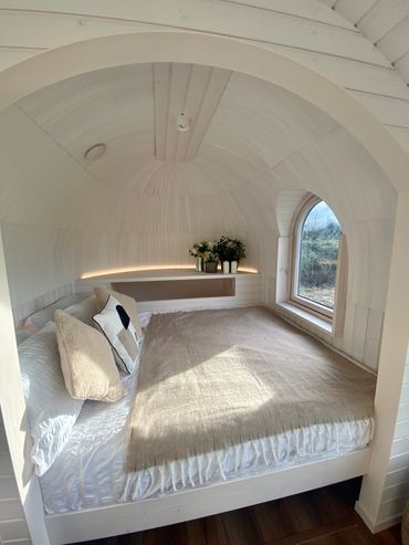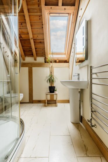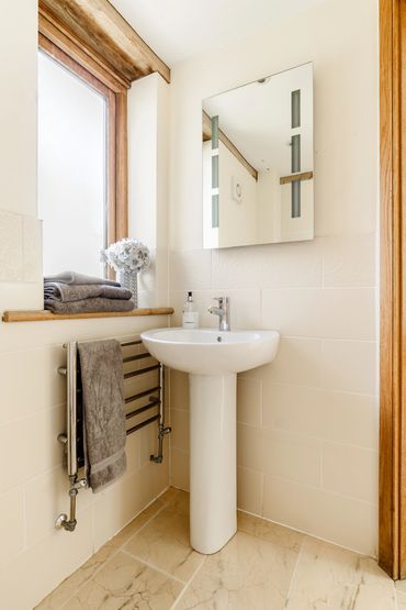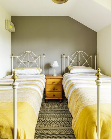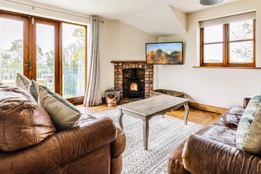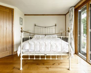 The downstairs bedroom is spacious, bright and airy. The french doors open onto a patio area with idyllic rural views.